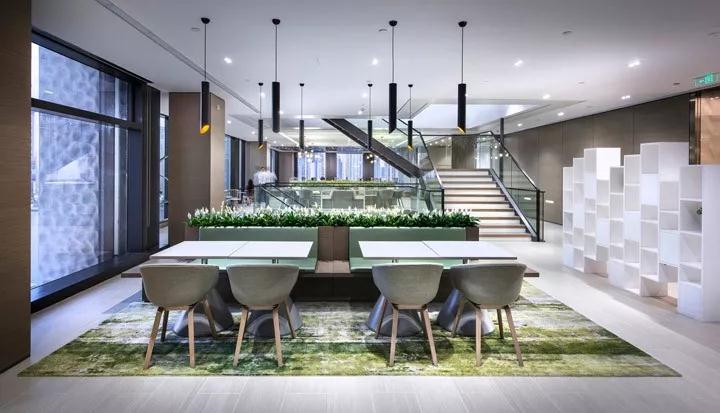 清透的玻璃和充滿生機(jī)的綠植墻打造的步行樓梯,以此鼓勵(lì)內(nèi)部人員的流動。同時(shí)周邊開放的設(shè)計(jì)意在創(chuàng)建一種基于動態(tài)的工作模式(ABW),通過協(xié)作空間將人們聚集在一起。