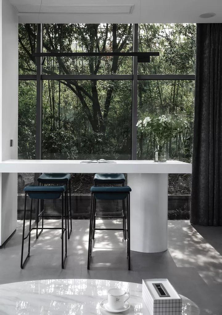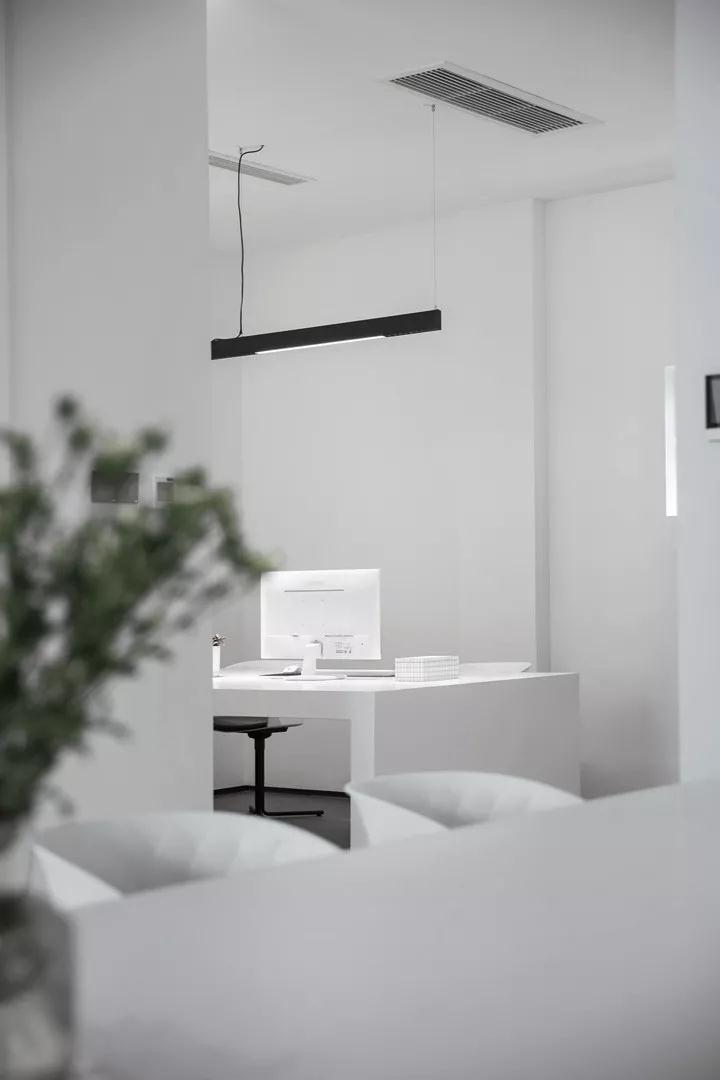 在色彩上,回歸對“無”的一種思考。設計需要一種克制的色彩,而且充滿張力和想象力。在豐富多彩的世界里,白色最接近內心,最為尊貴,也許是最絢麗多彩的顏色。設計師選擇了白色,白色的天花,白色的墻面,白色的家具,少許低飽和度的綠色統一在灰色水泥地面中,形成對比,促進著情緒和情感的激發。