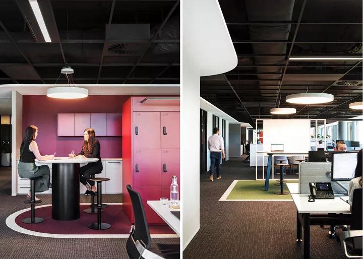 開放工作區沿外窗布局,寫字樓裝修設計團體以最大限度獲取自然光照。曲線形設計融入到原本的線性空間,給人以柔軟和溫暖的感覺。以大自然為靈感的鮮明色調包括深紅、珊瑚色、森林綠、水鴨色和墨藍色,每種顏色都構筑出各自不同的功能區域,共同烘托出一個時尚優雅的空間氛圍。