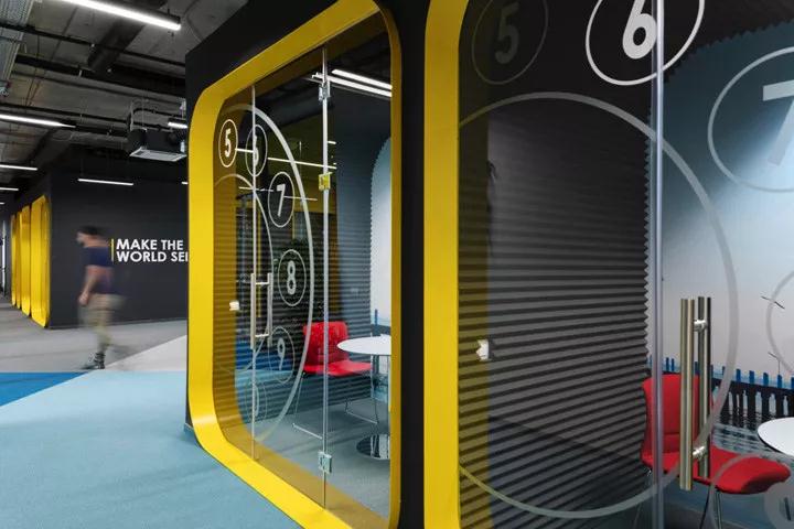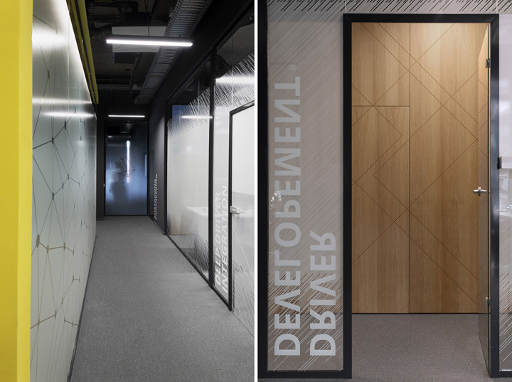 在任何情況下用戶的視覺和聽覺舒適性都是優(yōu)先考慮的。公司的業(yè)務(wù)詳情需要高度的私密性,這些都通過各種各樣的飾面得以實現(xiàn)。裝修公司設(shè)計團(tuán)隊為公司創(chuàng)建了一套完整的視覺體系,包括玻璃上的平面圖形、壁紙和墻面圖形等。以企業(yè)色制作的墻面和地面圖形,以及根據(jù)不同功能和光線而應(yīng)用的不同透明度的玻璃隔墻和木與黑色金屬制作的隔斷等。