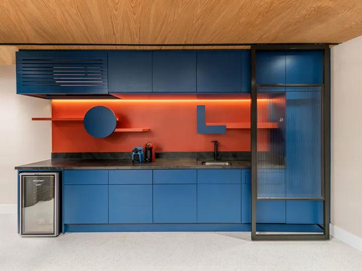 如果說廚房是整個空間的核心區域,那么人員區域就是這種情況下的重要工作和集合點。木質天花板,柔和的色彩以及自定義的壁櫥可以展示品牌的視覺識別。一套高低雙層設計的會議桌非常有趣,可以滿足不同類型的會議需求。頂面與周圍的發光鏡組合在一起,形成有趣的光影視覺效果。