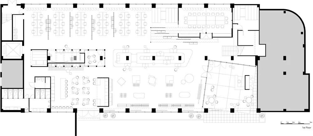 兩層的核心空間被設計為開放式溝通和互動的聚集地,而外窗附近的明亮區域是員工工作的地方,并仔細考慮了隱私需求。