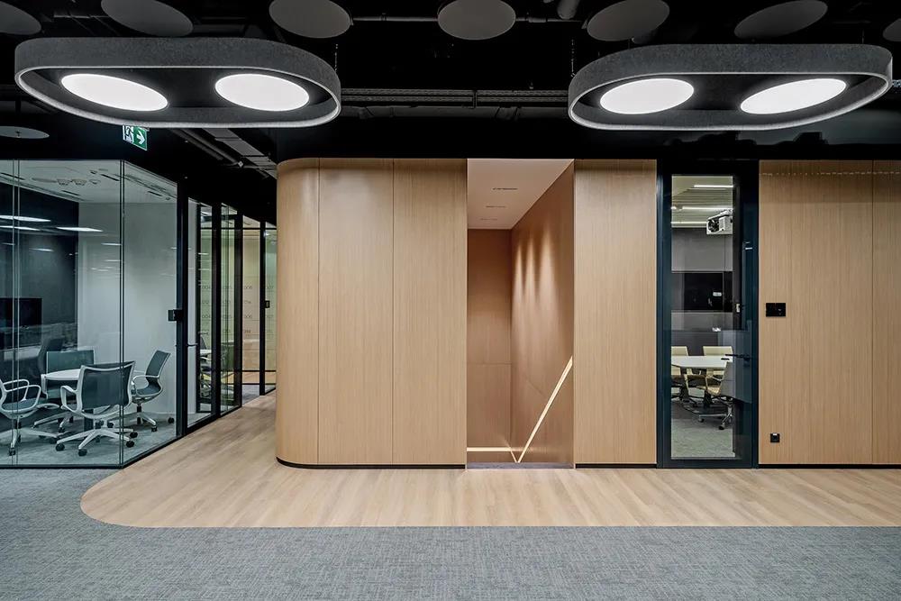 會議室的照明系統(tǒng)采用傳感器進行智能開關控制。深圳辦公室裝修設計流暢的弧線是本案的重要裝飾元素,源自汽車的經(jīng)典造型結(jié)構(gòu)。極簡色彩搭配黑、白、灰底色,勾勒出精致、簡潔、理性的專業(yè)品質(zhì)空間。溫暖柔和的橡木墻板和部分鋪裝的木紋地板以柔和的淺米色配色融入整體氛圍的營造。軟裝家具的亮色搭配,為開放的工作空間增添了多樣性,豐富了空間視覺。本案深圳裝飾公司所有裝飾材料均取得環(huán)保相關證書。